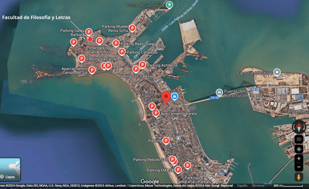 Informamos que la ciudad de Cádiz cuenta con pocas plazas de aparcamiento gratuito debido a sus limitaciones de espacio. Es por ello que recomendamos acudir a uno de los parking públicos disponibles en los alrededores de la Facultad de Filosofía y Letras, y que se detallan en la imagen de abajo.